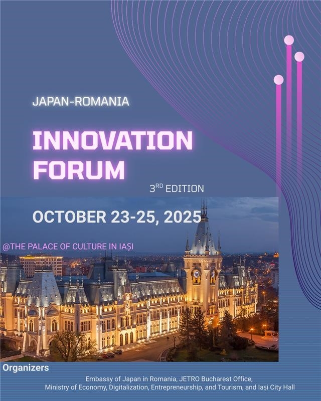 From October 23 to 25, the Embassy of Japan in Romania, in collaboration with the JETRO Bucharest Office, Iasi City, the Ministry of Economy, Digitalization, Entrepreneurship and Tourism, and the Ministry of Education and Research, will host the 3rd edition of Japan-Romania Innovation Forum.