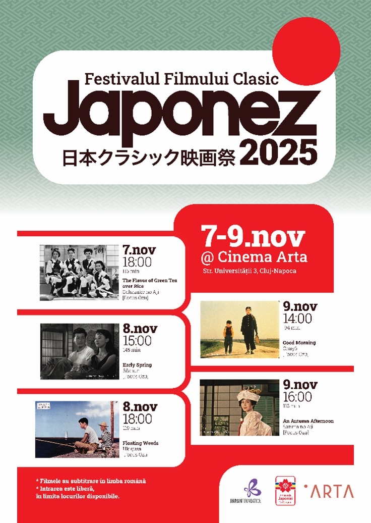 11月、日本クラシック映画祭2025を開催します!今年はクルージュ=ナポカ及びブカレストの2都市で、黒澤明監督、溝口健二監督と並ぶ日本映画界の三大巨匠の一人、小津安二郎監督の作品を5本も上映します。小津監督は、日常の美しさや家族の感情を巧みに描く独自の「小津スタイル」や、低いカメラ位置・静かな編集などの視覚的技法で知られております。