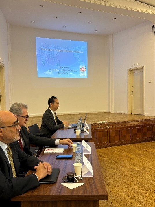 11月14日、片江大使は、ブカレスト大学日本語専攻開講50周年を記念したラウンドテーブル「From Past Roots to Future Horizons: Romania and Japan」に出席しました。片江大使は、日ルーマニア関係の歩みを紹介するプレゼンテーションの中でブカレスト大学の長年にわたる日本語教育の歴史を称え、継続のために費やされてきた類稀なる努力に謝意を述べました。