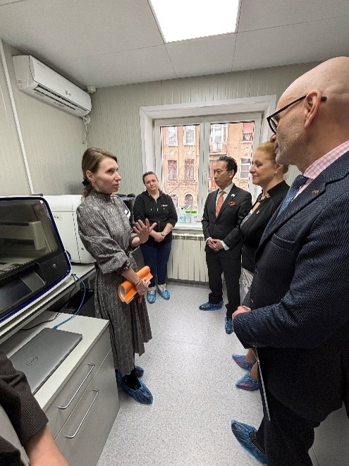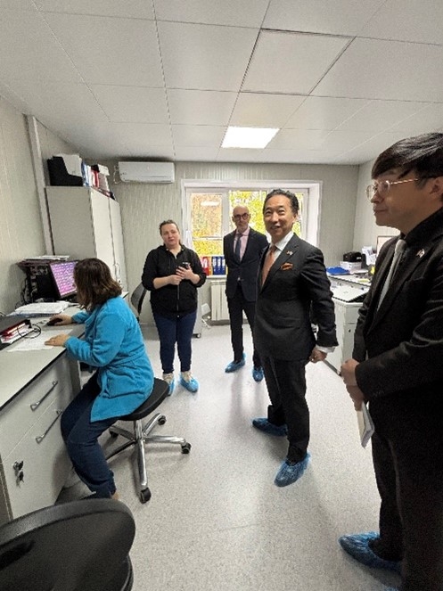 11月18日、片江大使は当地WHOルーマニア事務所関係者とともに国立公衆衛生研究所を視察しました。同研究所は、WHOルーマニア事務所と協力して、ルーマニア・ウクライナ国境付近におけるポリオウィルス等の感染症対策のための廃水調査を実施しています。日本は、アジア欧州財団(ASEF)への資金提供を通じて、ウクライナ避難民支援に資する本プロジェクトを支援しています。
