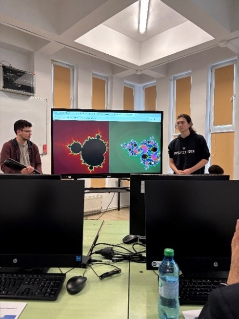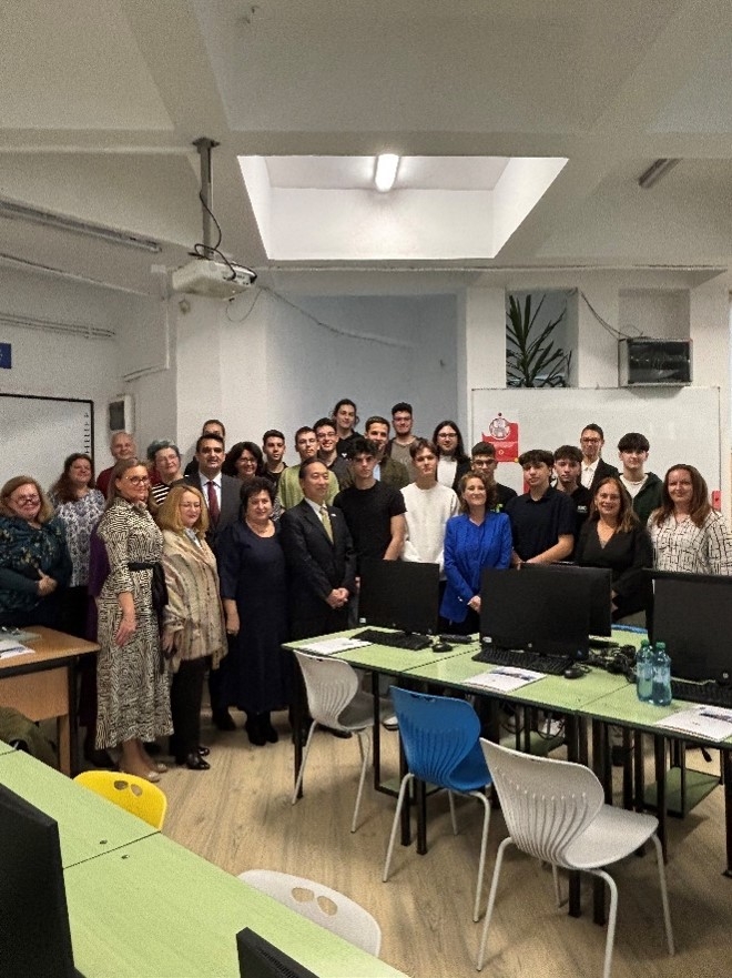 片江大使によるティベリウ・ポポヴィチウ高校のIT設備視察
