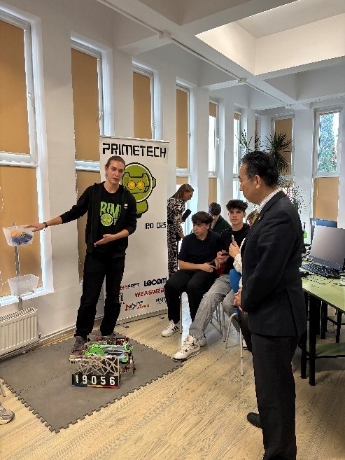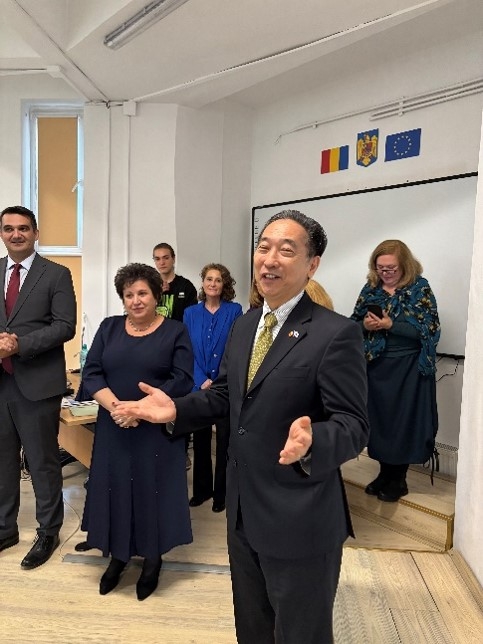片江大使は祝辞を述べ、実際に機材が使用されていることは嬉しい、今後この設備を用いて学んだ生徒が、日本とルーマニアを繋ぐ架け橋となることを期待する旨伝えました。
