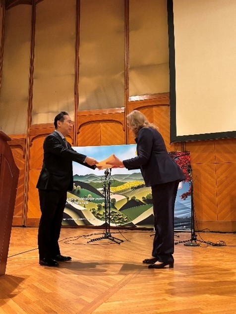この写真展は、スミアグロ・ルーマニアのパトリチア・マリア・シュティルブ社長の多大な貢献によって実現しました。シュティルブ氏は、2021年に同協会が開催した日本ルーマニア外交関係樹立百周年記念写真展「日本とルーマニアの人々と風景」の実現にも欠かすことのできない貢献をされるなど、両国間の写真を通じた文化交流に大きく寄与されました。大使は、こられの活動を高く評価し、シュティルブ氏にも感謝状を授与しました。