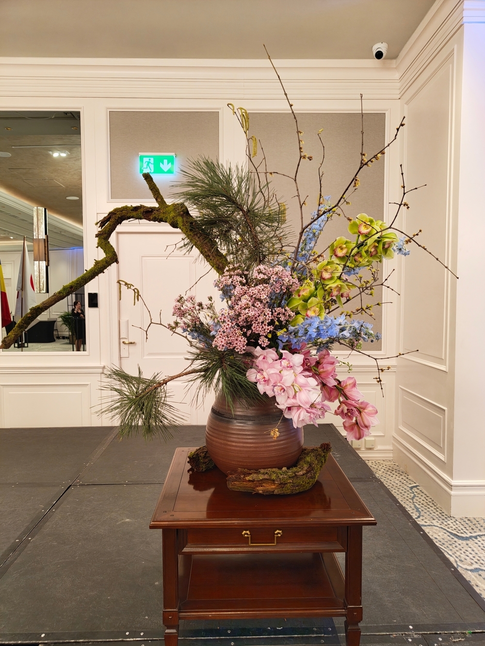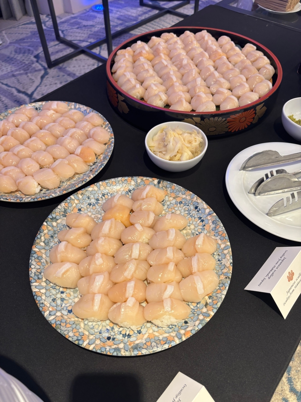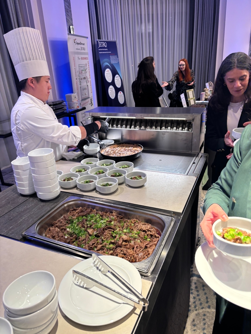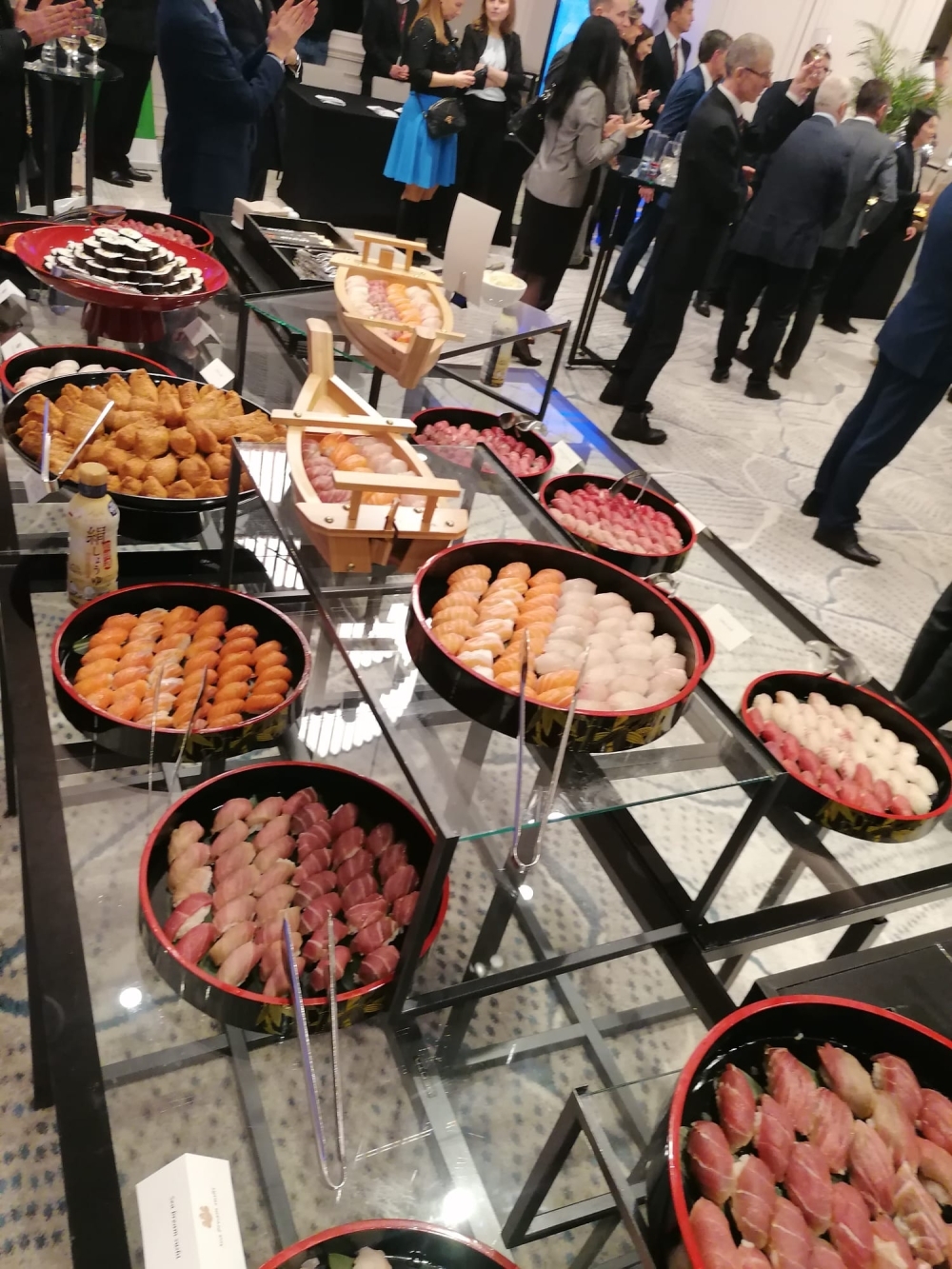 Toți invitații s-au bucurat de mâncăruri japoneze tradiționale, preparate cu ingrediente originale, însoțite de sake japonez. Ne exprimăm recunoștința față de membrii Ikebana International, care au aranjat decorațiunile florale de pe scenă; față de cvintetul de alămuri și soliștii de la Universitatea Națională de Muzică din București, care au interpretat imnurile naționale; precum și față de companiile japoneze participante, care au sprijinit cu amabilitate recepția prin expoziții proprii.