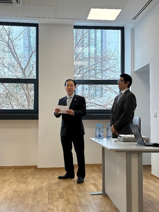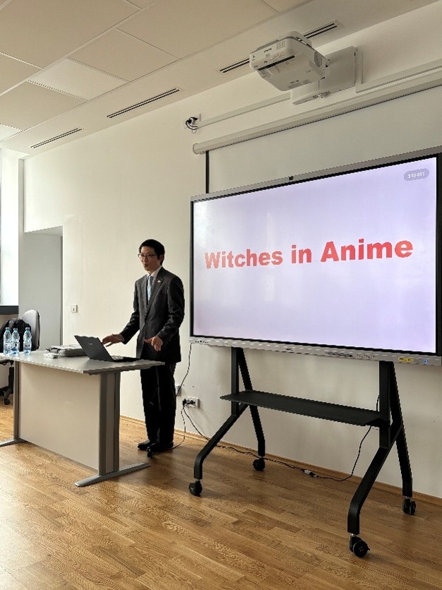 4月3日、片江大使は、ルーマニアの伝統的な風習を研究している角悠介氏による、ブカレスト経済大学での講演会に出席しました。講演では、同氏が言語学の知見を活かし、日本のアニメや漫画に見られる呪文の類型化や、ルーマニアに残る呪文の文化との対比などについて語り、聴講者は大変興味深く聞き入っていました。