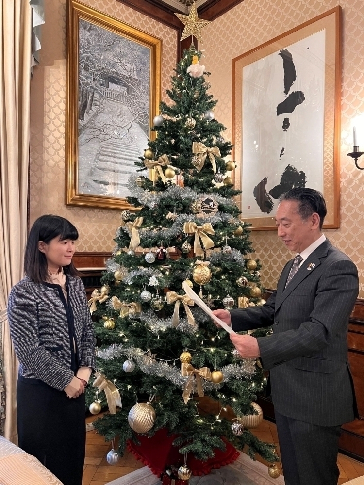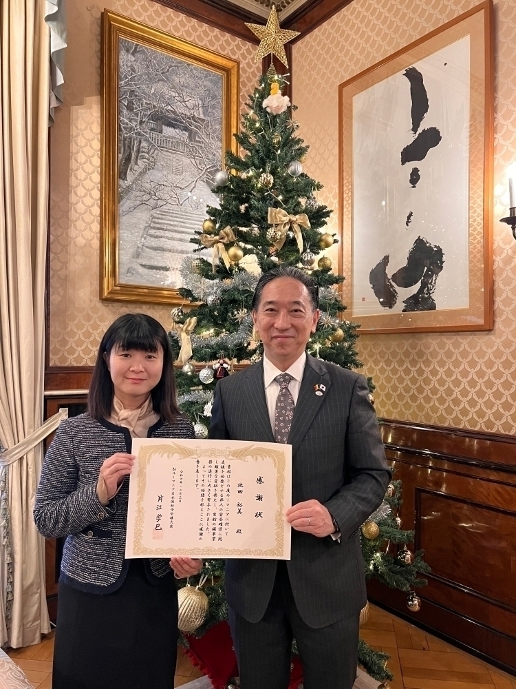 12月3日、当地でウクライナ避難民などへの支援活動を行っているNGOグッドネーバーズ・ジャパンの池田氏に対して、片江大使より感謝状が授与されました。