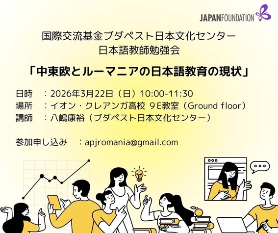 Pe data de 22 martie a.c. va avea loc un seminar pentru profesorii de limba japoneză din România, susținut de Dl. Yasuhiro Yajima de la Centrul din Budapesta al Fundației Japonia, având tema: ”Starea actuală a învățământului în limba japoneză în Europa de Est și în România”, seminarul va examina caracteristicile și starea actuală a învățământului în limba japoneză în România, în context global, incluzând și activități de grup.