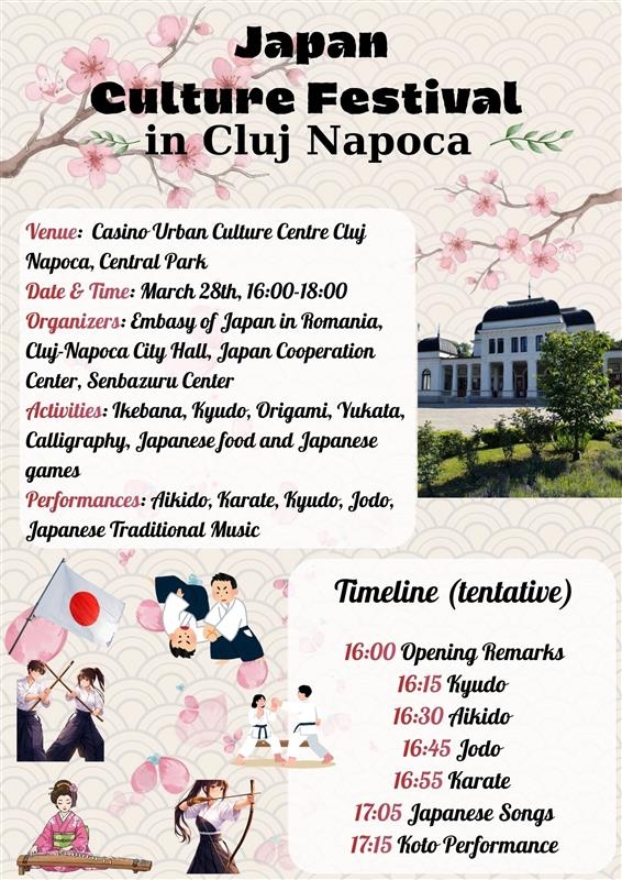 Pe 28 martie, între orele 16:00 –18:00, Ambasada Japoniei în România va organiza Festival Cultural Japonez la Cazino – Centrul de Cultură Urbană Cluj-Napoca, în colaborare cu Primăria Cluj-Napoca, Centrul de Cooperare România-Japonia și Centrul de Studii Japoneze Senbazuru din cadrul Universității Babeș-Bolyai.