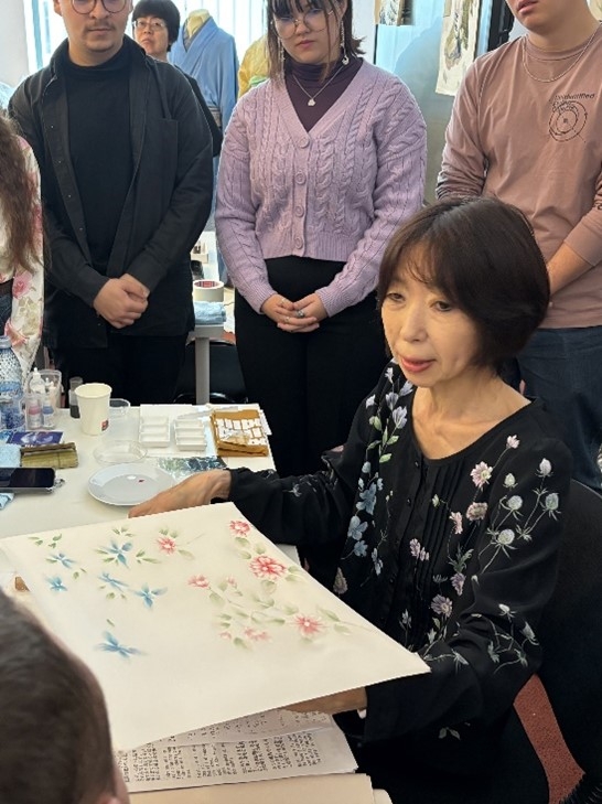 10月17日、片江大使は、ルーマニア・アメリカ大学で手描き友禅作家の笠原以津子氏による友禅ワークショップに参加しました。片江大使は、日本の伝統的な手描き染め物である「友禅」の歴史や笠原氏の活躍に触れた上で、このワークショップを通じて日本文化への理解が深まり、日本とルーマニアの文化交流が強化されることを期待する旨述べました。